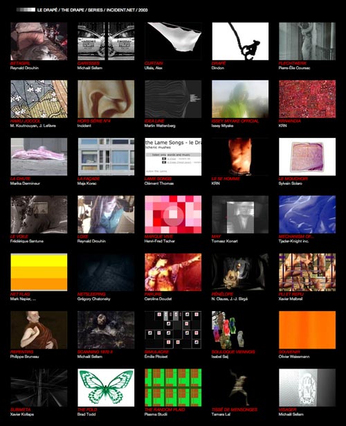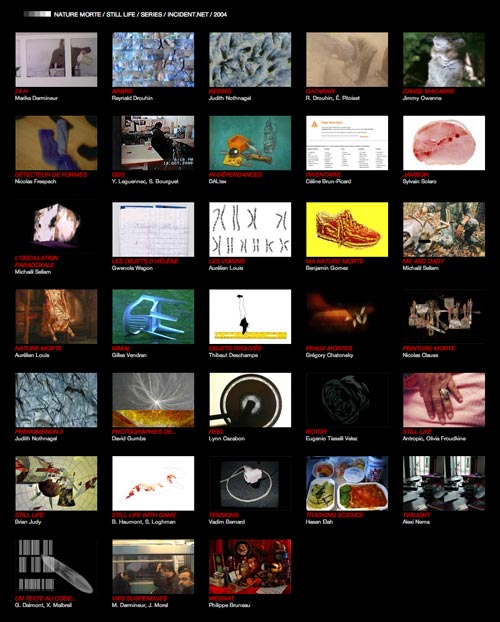 POLLUTION (2009-11) : http://www.incident.net/hors/pollution/ LE MONOCHROME / THE MONOCHROME (2007-08) : http://www.incident.net/hors/monochrome/ LE DETAIL / THE DETAIL (2006) : http://www.incident.net/hors/detail/ LE NU / THE NUDE (2005) : http://www.incident.net/hors/nu/ NATURE MORTE / STILL LIFE (2004) : http://www.incident.net/hors/nature_morte/ LE DRAPE / THE DRAPE (2003) : http://www.incident.net/hors/drape/ LE PAYSAGE / LANDSCAPE (2002) : http://www.incident.net/hors/landscape/ LE PORTRAIT / THE PORTRAIT (2001) : http://www.incident.net/hors/portrait/