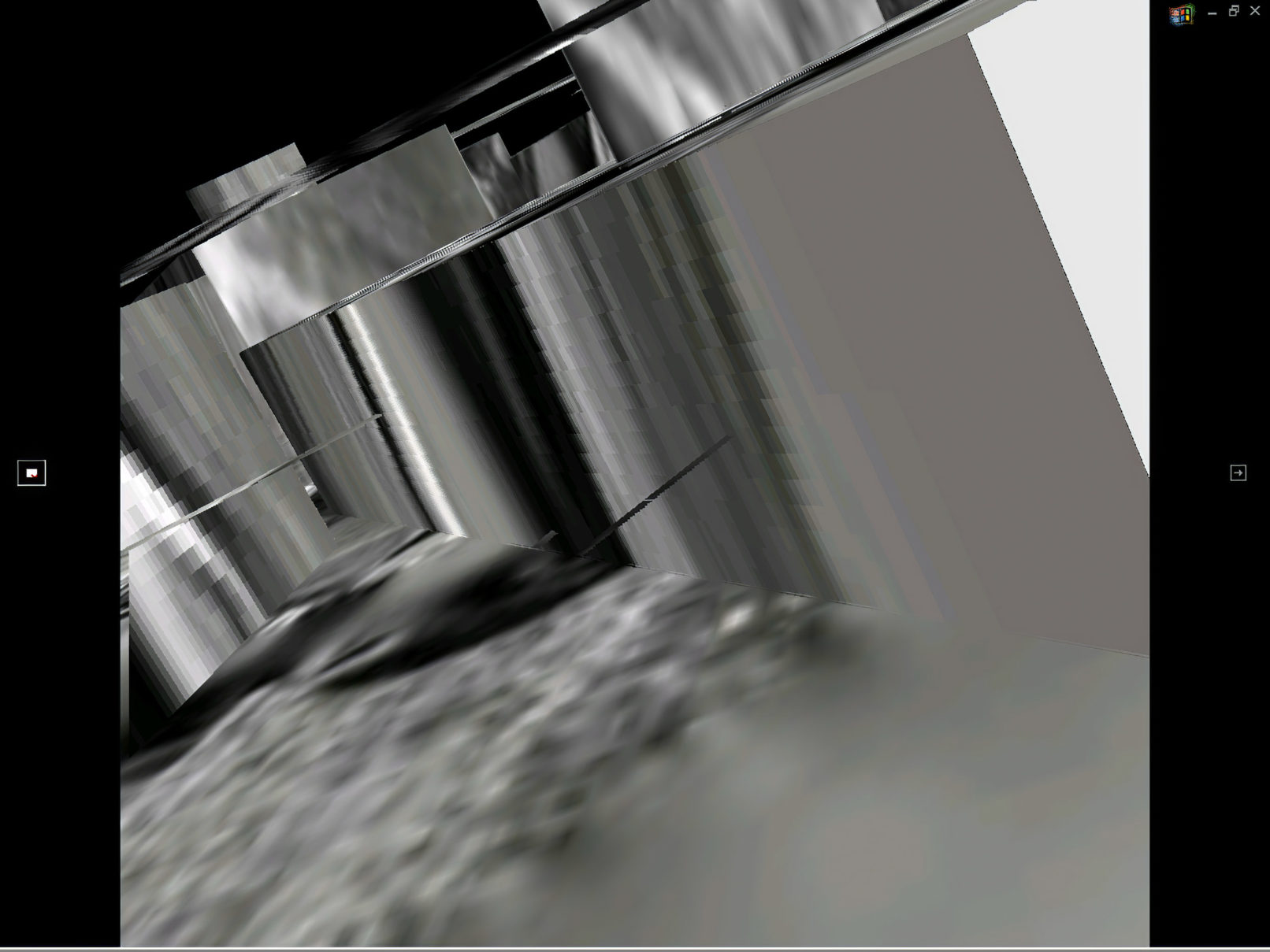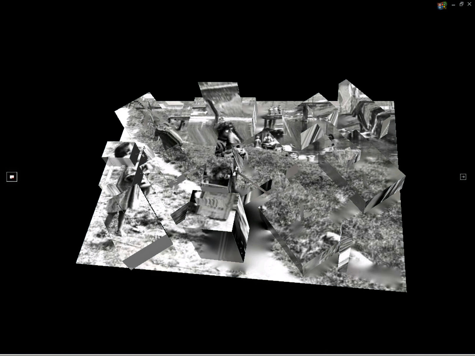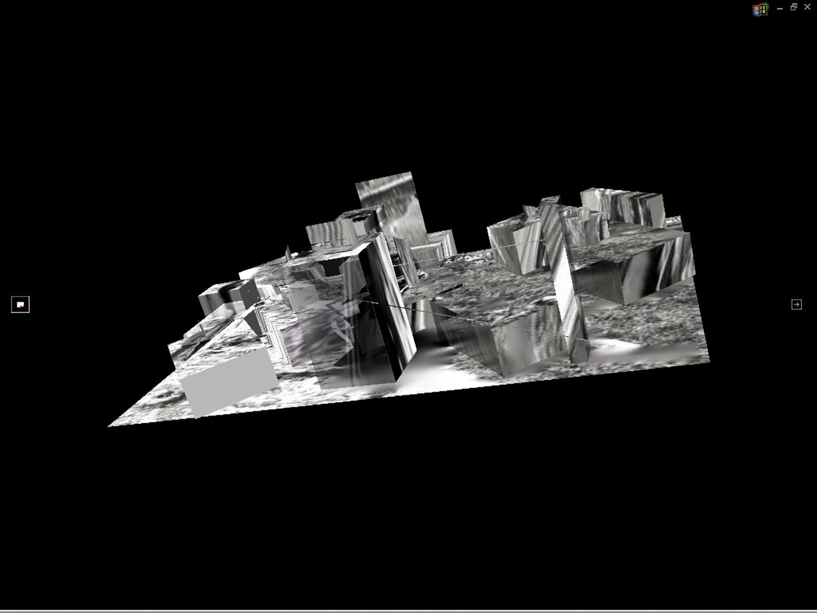 La ville n’est pas ici un chemin, plutôt une lisière, un no man’s land, un bord qui se prolongerait, la frange d’un bord. Cette matrice en VRML se présente comme un monde paradoxal constitué de petits fragments d’espaces qui, au premier regard, correspondrent à une géométrie classique mais qui au cours du déplacement interactif se révélent juxtaposer trois perspectives : celle de l’image, celle de l’imaginaire et celle de la cartographie. Ces perspectives ne parviennent jamais à se correspondre, instaurant par là même un décalage dans la représentation urbaine.