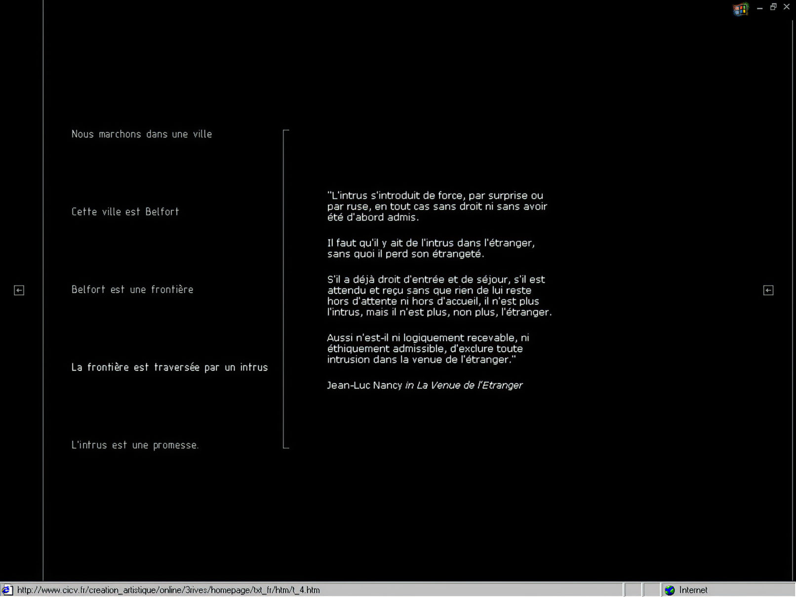 Partant du lieu de l’exposition, Belfort, il s’agit de reconstituer ou d’inventer une ville imaginaire mêlant dans un même espace virtuel des éléments architecturaux, des documents d’archives, des visages, des témoignages. Belfort est une ville de frontières.