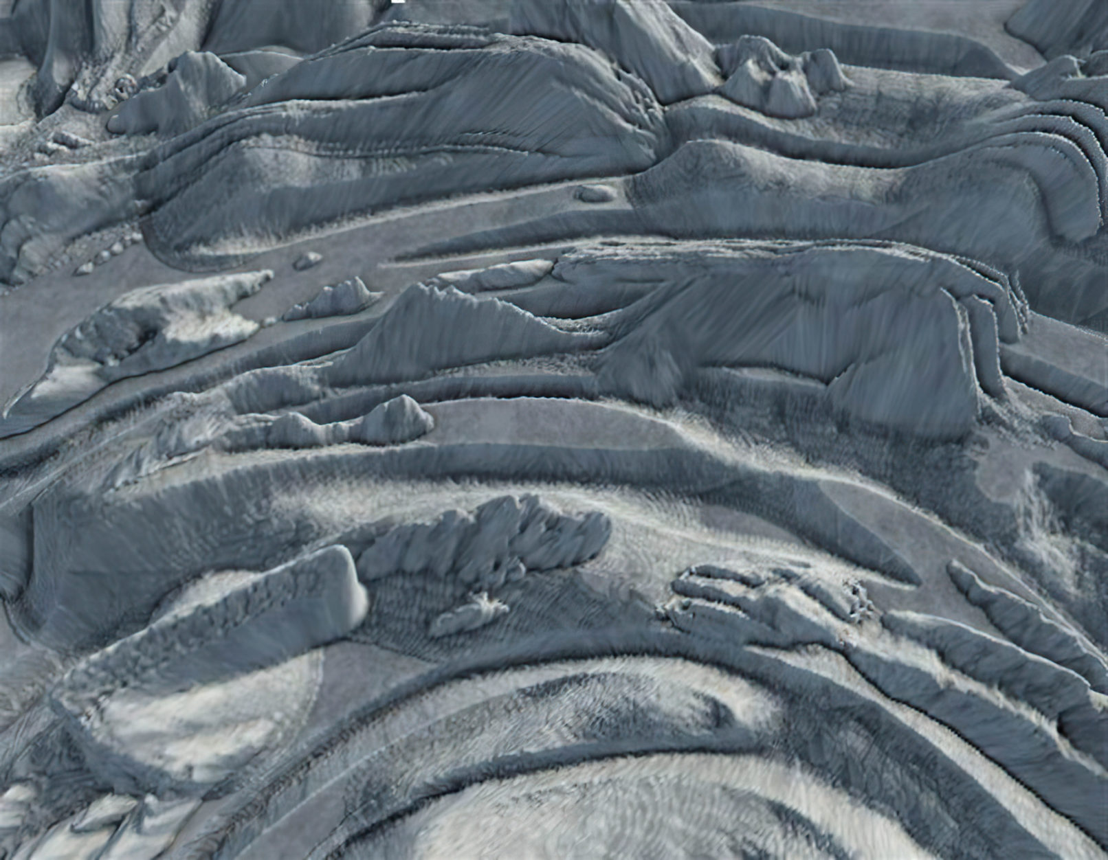 The artist’s fingerprint is used to create an infinite landscape in a video game engine. This landscape is deserted and icy, all traces of the human species seem to have disappeared. Depending on how far away we are, we can recognize the fingerprint or get lost in the ravines of this lifeless space. The software makes it possible to create a generative displacement that is always different.