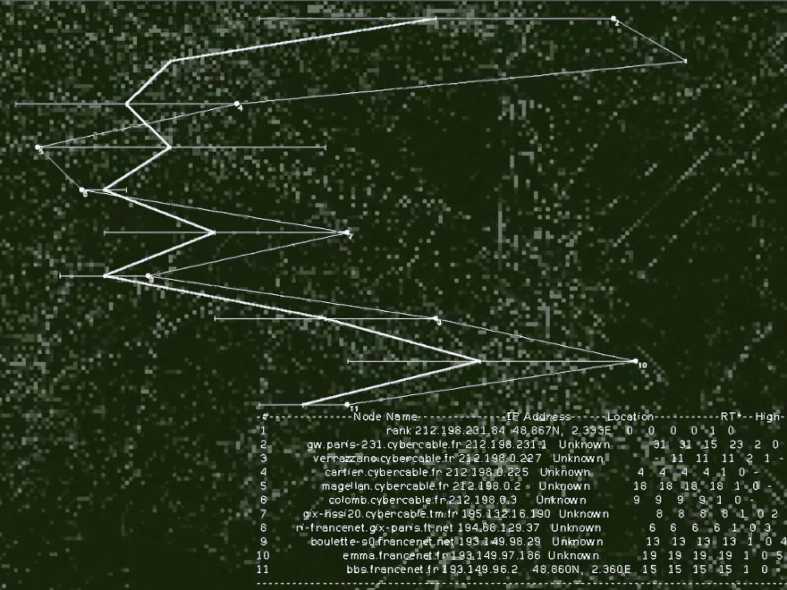 Avec Nervures j’ai voulu inverser ce parcours de l’image pour montrer que la consultation de Rhizomes était elle-même territorialisée : ici les images ne sont plus visibles, on s’attache uniquement aux parcours physiques des informations entre les serveurs qui hébergent les images et un poste-client, le mien. J’ai utilisé un logiciel de traçage permettant de visualiser précisément le chemin que parcourt une information pour arriver jusqu’à chez moi.